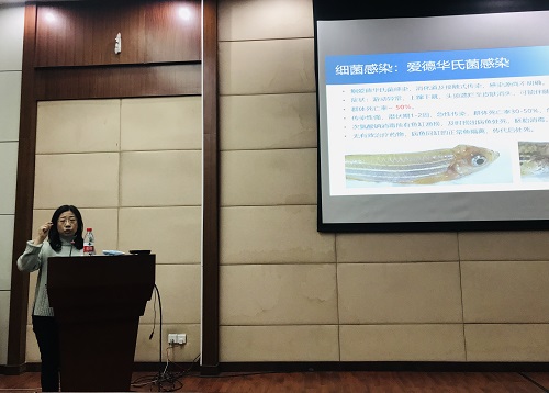 报告中,潘鲁湲介绍了由分枝杆菌、爱德华氏等细菌感染、微孢子虫感染、真菌感染、设备故障等原因,所引起的斑马鱼鳞片异常、腹水严重、尾部溃烂、鱼鳃充血、脊髓弯曲等症状。其中,鱼房中最易爆发的爱德华氏菌感染,其传染性强、潜伏期长、群体死亡率高达50%,危害极大。为保障模式生物斑马鱼的健康,包含净水供水单元、水体控制循环单元和养殖组单元的“水生动物循环养殖系统”至关重要。系统内的探头、气泵、空调、生物膜与空调等环节出现故障,均可能导致斑马鱼“生病”,影响实验结果。因此她强调,日常巡视、设备维护及水质监控是维系鱼房“健康”必不可少的重点工作。最后,潘鲁湲分享了其实验室在斑马鱼的配鱼、体外受精实验的经验,并解答了在不同发育阶段,水温、pH、溶氧率与养殖密度等因素对其繁育的影响。
