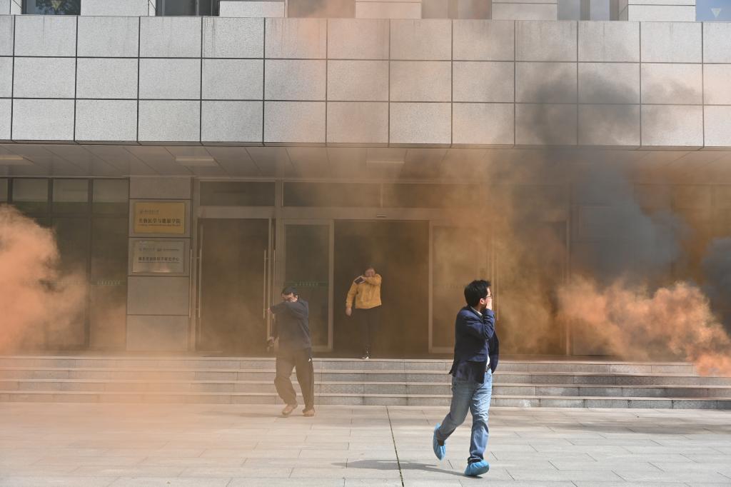上午10点,演习正式开始。随着演习烟雾弥散,楼内烟雾报警器被触发,学院立即启动应急预案并报校园110,楼内消防广播播报紧急通知,志愿消防队迅速组织人员疏散,引导楼内师生从南北5个门就近疏散至楼下广场。与此同时,校园应急救援队抵达现场,迅速展开灭火作业,消防员用高压水枪彻底扑灭了火势。随后,建安部孙勇老师为现场师生详细讲解演示了二氧化碳灭火器的适用范围、使用要点以及注意事项。现场师生三人一组,依次进行了灭火器实操演练。