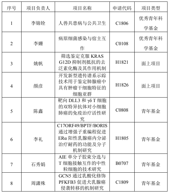 近日,2023年度国家自然科学基金申请项目评审结果公布。学院集中受理期共获批国家自然科学基金8项,项目资助率32%。获资助项目包括优秀青年科学基金项目2项、面上项目2项、青年科学基金项目4项,分布在国家自然科学基金委的生命科学部4项、医学科学部3项、化学科学部1项,具体如下: