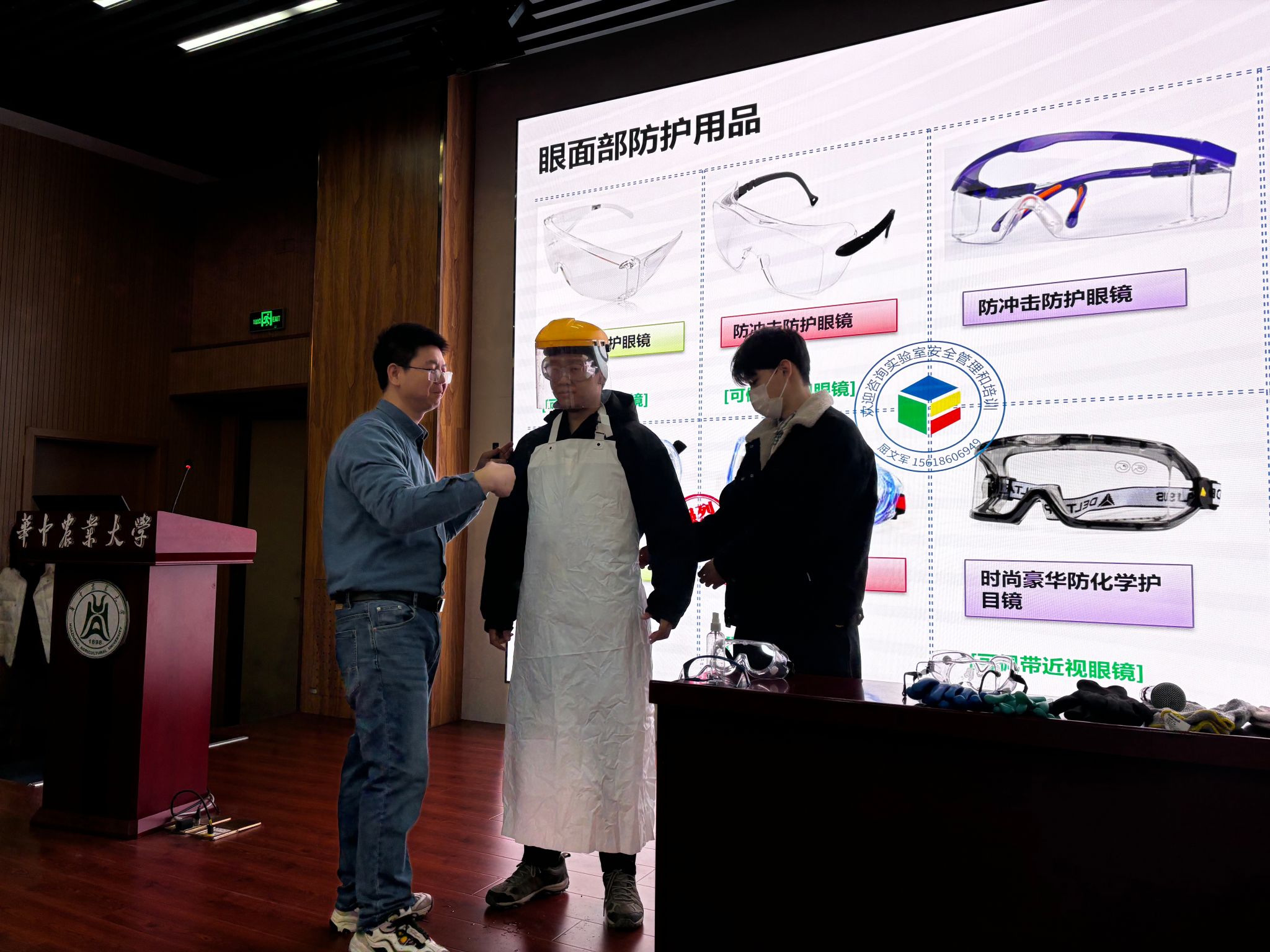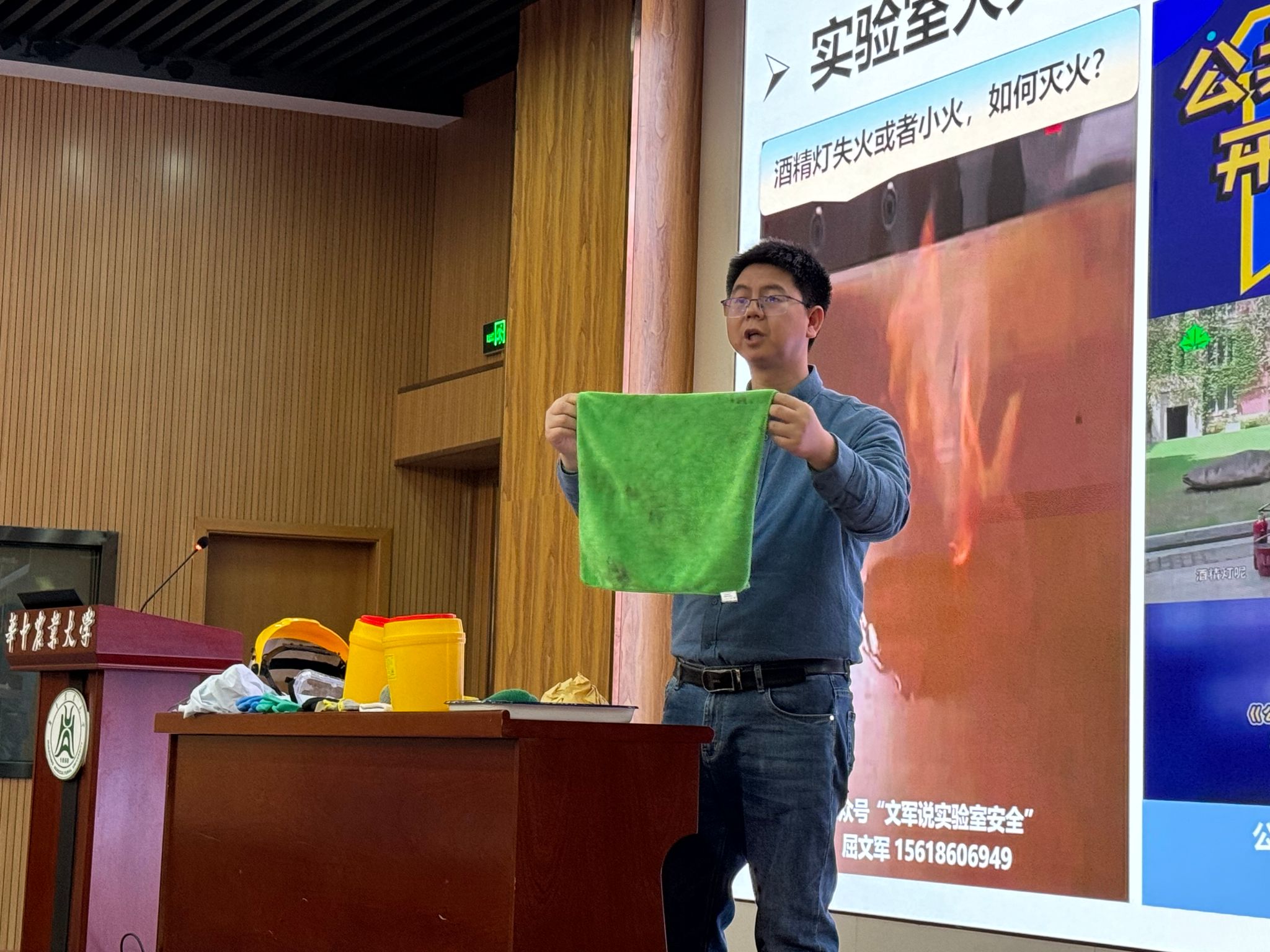 屈文军从“实验室个人安全防护”和“实验室安全事故应急处置”两大模块,结合实物展示、现场互动等方式,进行了系统的实验室安全知识讲解。 “实验室服尽量选择纯棉材质。”通过一个个视频案例,他讲解了实验室中个人防护要点,强调防护服、手套、护目镜等装备的正确选择与使用方法,以及在紧急情况下如何快速且正确地佩戴。随后,他围绕化学品灼烧事故、化学品泄漏事故、通风橱/烘箱着火等实验室常见事故,强调了实验操作过程中潜在的风险点和事故发生后的应急处理方法。他以硫酸为例,说明强酸强碱灼烧会迅速破坏皮肤组织,强调一旦发生此类事故,应立即用大量流动清水冲洗受伤部位,时间不少于 15 分钟,以稀释和带走化学品,随后根据灼伤程度采取相应的医疗救治措施。通过列举近年来高校发生的实际案例,让参会师生们深刻认识到实验室安全应急能力绝非可有可无,而是保障生命安全、科研平稳开展的关键所在。