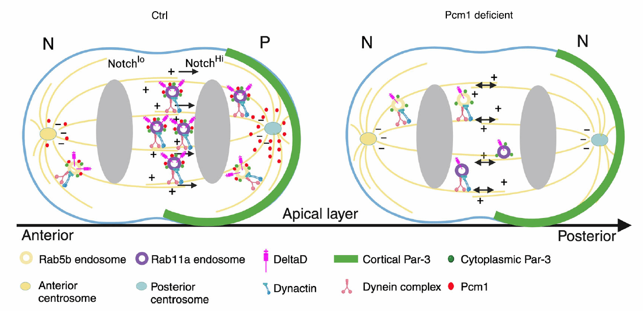 (通讯员 王艺琪)大脑皮层发育过程中,神经干细胞的不对称分裂对于维持干性与产生新生神经元至关重要。不对称分裂依赖中心体(centrosome)结构和功能的差异化,如母体中心粒与子体中心粒在微管组织、信号转导和细胞命运调控方面的不同。然而,目前对于中心体不对称如何与细胞内部其他极性结构(如内体运输系统)协同影响神经干细胞命运的机制仍缺乏系统性的理解。因此,阐明中心体不对称与细胞极性运输之间的联系,是揭示神经发育机制的关键。