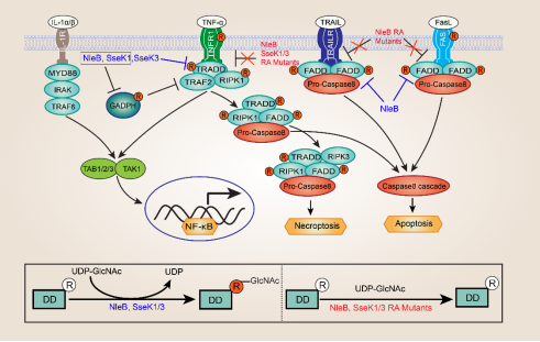 这个家族包括:(1)肠致病性大肠杆菌(EPEC)/肠出血性大肠杆菌(EHEC)/啮齿类柠檬酸杆菌(Citrobacter rodentium)中的NleB家族;(2)沙门氏菌中的SseK家族;(3)铜绿假单胞菌(Pseudomonas aeruginosa)及脑膜炎奈瑟氏菌(Neisseria meningitidis)中的EarP家族。NleB/SseK家族的蛋白可以使细胞中的死亡受体及其接头蛋白发生精氨酸N-乙酰葡萄糖胺修饰,修饰后的死亡受体及其接头蛋白之间不能寡聚,进而阻断了死亡受体介导的细胞程序性死亡通路(Li et al., Nature, 2013; Ding et al., Molecular Cell, 2019; Xue et al., bioRxiv, 2019)。EarP家族蛋白的生理底物是存在于铜绿假单胞菌及脑膜炎奈瑟氏菌中的翻译延伸因子(EF-P),EarP可以使EF-P发生精氨酸N-鼠李糖基化修饰,该修饰可挽救聚脯氨酸导致的翻译延宕,减缓核糖体的失速效应。由于铜绿假单胞菌及脑膜炎奈瑟氏菌中存在着众多毒力蛋白及抗生素耐药因子等蛋白均存在着多聚脯氨酸序列,因而,鼠李糖基化修饰的EF-P对细菌自身的环境适应性以及一些致病菌的毒性维持至关重要。