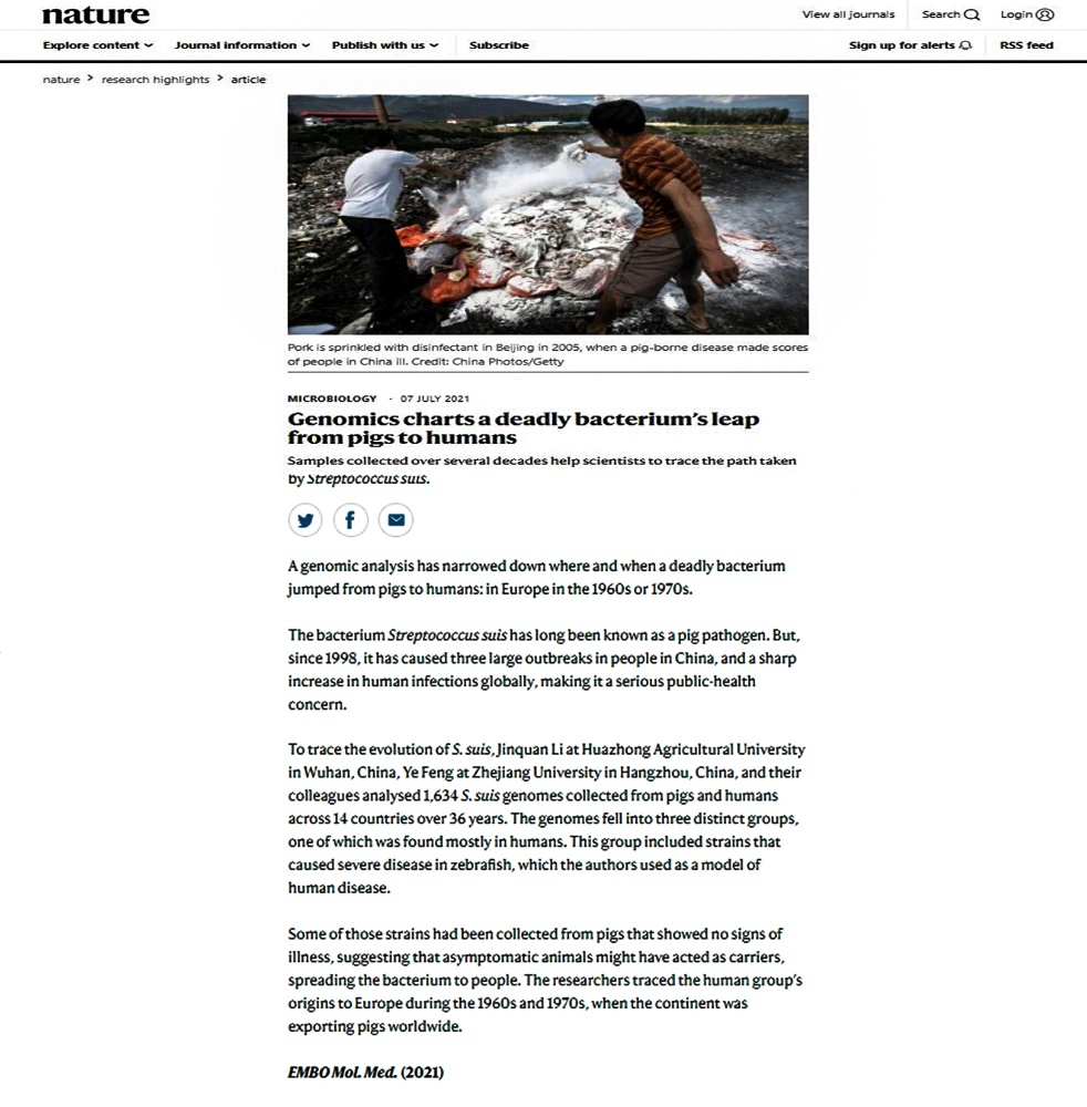 近日,我校太阳集团tyc33455李锦铨副教授研究团队在基础和转化医学EMBO Molecular Medicine上发表了题为“The global emergence of a novel Streptococcus suis clade associated with human infections”的研究论文,引起了领域内的高度关注。7月7日出版的Nature杂志将该成果评选为研究亮点(Research Highlights)并跟踪报道,从“One Health”的角度进一步肯定该研究工作的价值与意义。