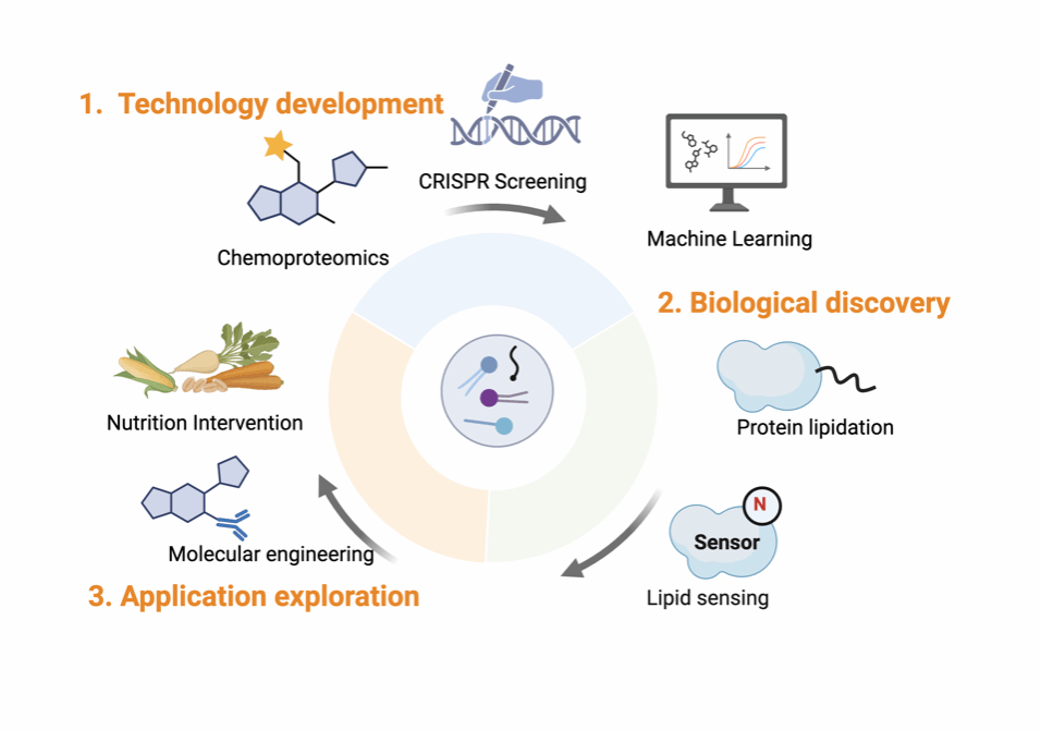 实验室聚焦脂质化学生物学的研究,专注于细胞脂质营养素感知机制的解析及蛋白质脂基化的功能和操控,侧重研究方法的开发,感知机制的发现,及其在代谢疾病中的功能探索。主要研究方向包括: